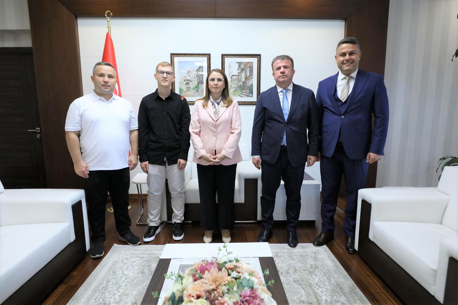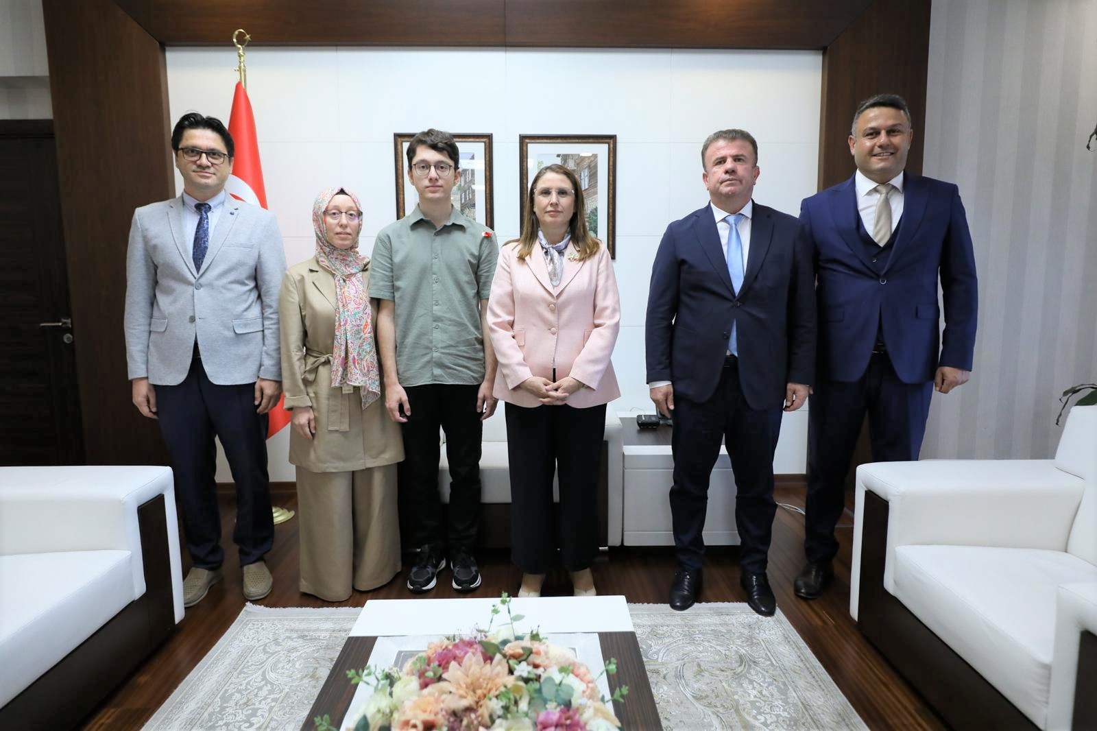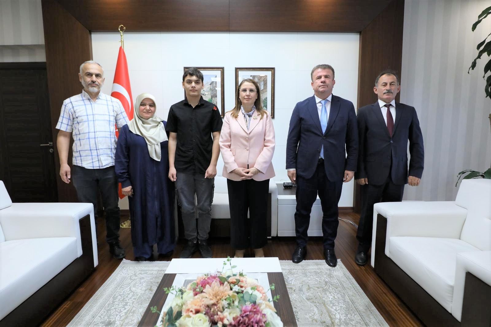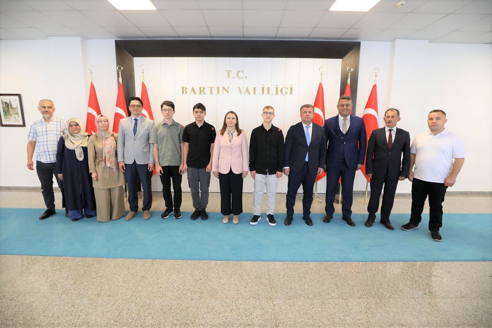 Liselere Geçiş Sistemi (LGS) kapsamında Türkiye 1'incisi olan Bartın Merkez İmam Hatip Ortaokulu öğrencisi Mehmet İbrahim KARA ve Yükseköğretim Kurumları Sınavı'nda (YKS) başarı göstererek AYT Sayısal alanında bütün soruları doğru cevaplayan Hasan Sabri Çavuşoğlu Fen Lisesi öğrencilerinden Hüseyin Emirhan SOLAK ve Enes GÜNEŞ, okul müdürleri, aileleri ile birlikte Sayın Valimiz Dr. Nurtaç ARSLAN ve İl Millî Eğitim Müdürümüz Sayın Ramazan AŞCI ile bir araya gelerek öğrencilerimizi üstün başarılarından dolayı tebrik ettiler.